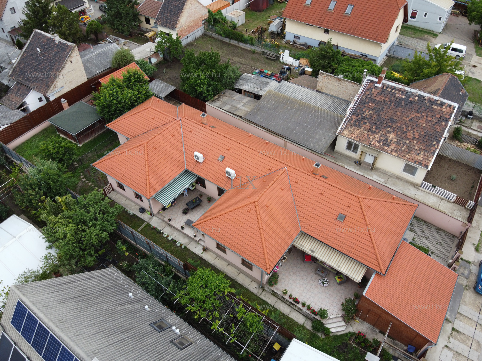 XIV. Alsórákoson csendes utcában eladó egy 2009-ben épült, kétgenerációs, 881nm-es telken lévő, 220nm-es, 5+2 szobás, duplakomfortos, cirkófűtésű, nagyon jó állapotban lévő, teraszos(33nm), központi klímával, szúnyoghálókkal és redőnyökkel felszerelt, világos, DNY-i fekvésű, tehermentes családi ház. A két lakás külön mérőórákkal rendelkezik. A kényelemről egy gyönyörű kert, fúrt kút, terasz, kerti szaletli, garázs, felszini parkolóhely, 20nm-es faház, riasztórendszer és az elektromos kapu gondoskodik. Közlekedése és bevásárlási lehetősége jó.
